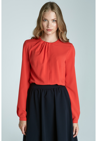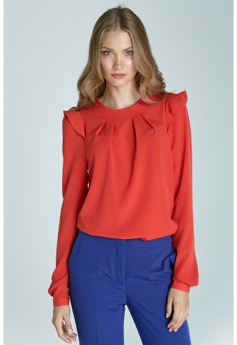 Démarquez-vous du reste avec cette blouse orange, originale et romantique. Sa coupe semi cintrée par des pinces au dos s'accompagne de volants sur les épaules, d'une encolure avec jeu de plis et le tout est confectionné dans un tissu soyeux, chic et élégant. Associez-la avec un pantalon habillé ou rentrée dans une jupe éclatante.