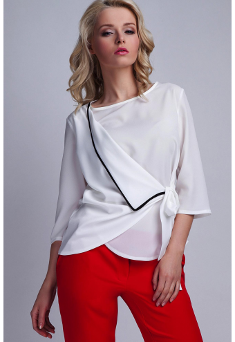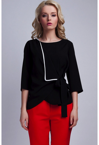 Cette petite blouse noire va vous coller à la peau toute la saison : Manches trois-quarts, encolure arrondie, pans à nouer sur le côté, ganse contrastante en satin... cette blouse noire et blanche combine toutes les tendances les plus élégantes de la saison. On adore son esprit cache-coeur avec son...
