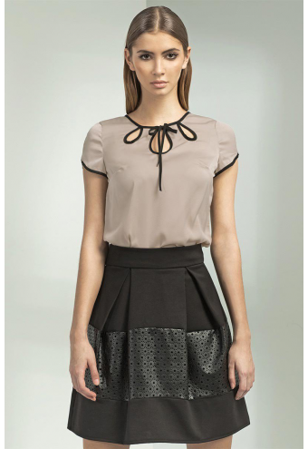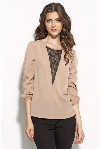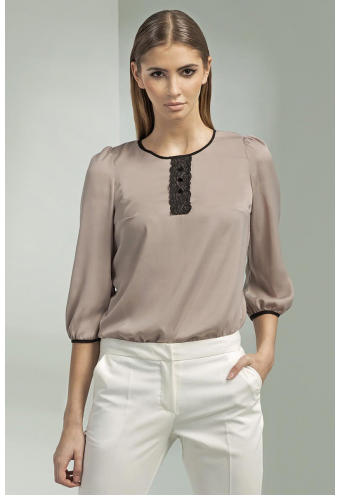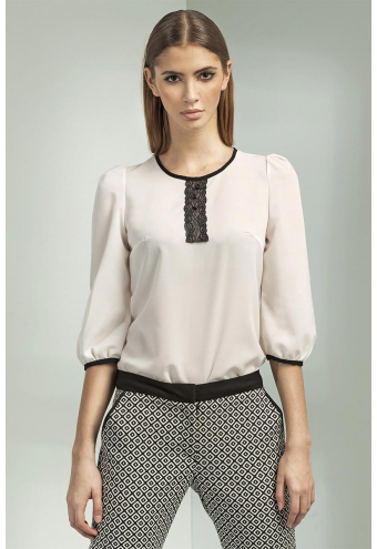 Avec son allure raffinée et élégante soutenue par un mélange contrastant de couleurs, cette jolie blouse beige fera passer toutes vos tenues au niveau mode supérieur. Nous adorons l'encolure arrondie, cernée d'une ganse en satin mat noir et soulignée d'un empiècement en dentelle...