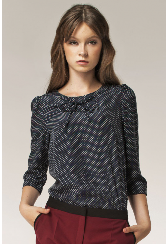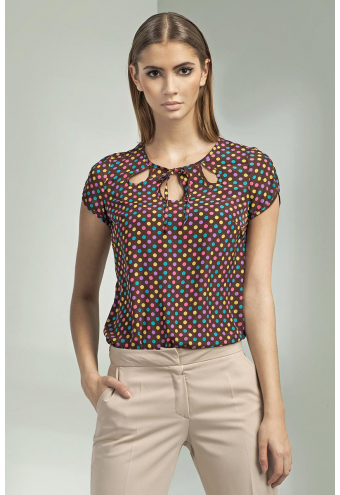 Parfaitement en accord avec la tendance mode de la saison, cette blouse fluide nous séduit par son encolure fantaisie. En effet, l'encolure arrondie de cette pièce est dotée d'un lien à nouer mais aussi de trois jolies découpes en gouttes d'eau. Son tissu imprimé à pois...