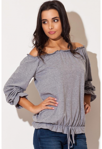Mettez vos épaules en valeur grâce à cette blouse bohème, grise. Confectionnée dans un tissu en coton majoritaire et dotée d'une encolure élastique souple, elle possède une coupe ample et des manches terminées par des volants sur les poignets, pour une style très romantique....