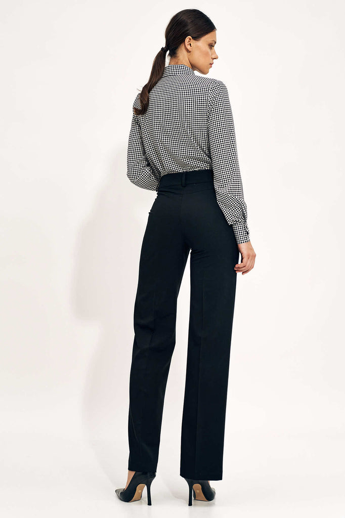 Pantalon noir taille haute, coupe évasée et boutons contrastants