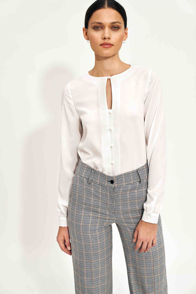 Ce chemisier original présente une encolure inhabituelle, qui est également boutonnée, ce qui le rend encore plus charmant.