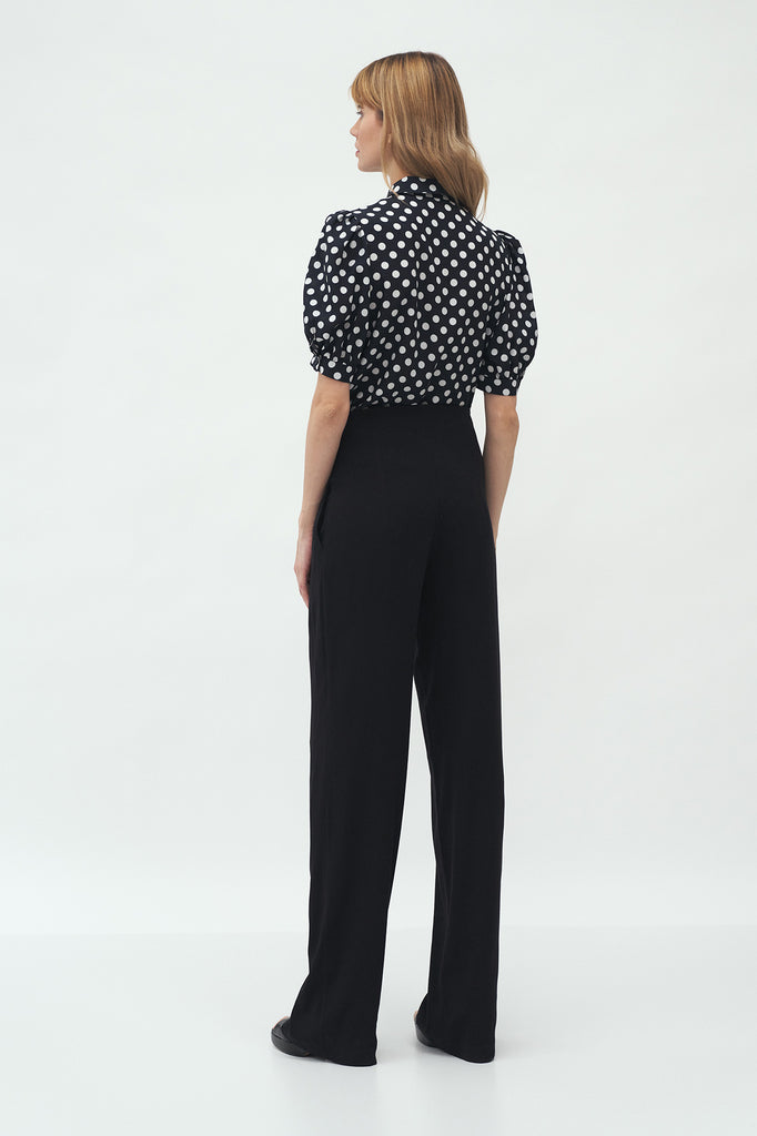 Associez-le avec son chemisier lavallière noir à pois blancs.