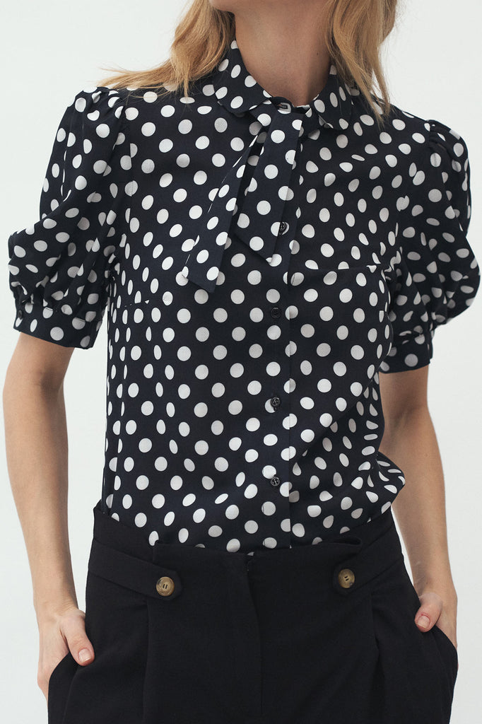 Associez-le avec son chemisier lavallière noir à pois blancs.